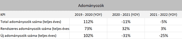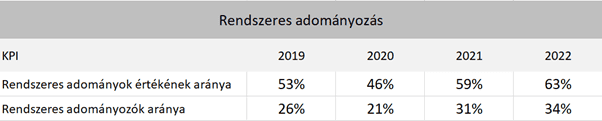2022-re a rendszeres adományozók száma és adományaik értéke tovább növekedett, miközben  jelentős növekedést (24%) sikerült végrehajtani az adományok átlagértékében, így 2021-ről 2022-re több mint 19%-os növekedést tudott produkálni a szervezet a teljes magánadományozási volumenben.
