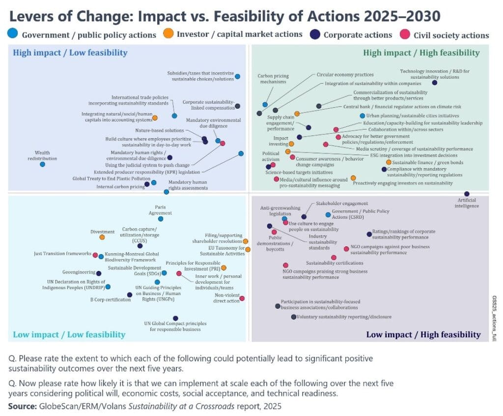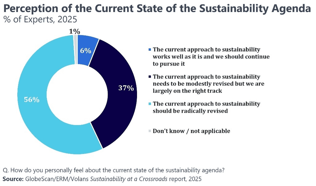 A Sustainability at a Crossroads (Fenntarthatóság válaszút előtt) című tanulmány egy 2025 májusában végzett, globális kutatás eredményeit összegezte. A kutatás a GlobeScan, az ERM Sustainability Institute és a Volans együttműködésében született, és benne több mint 840 fenntarthatósági szakértő véleményét gyűjtötték össze 72 országból.