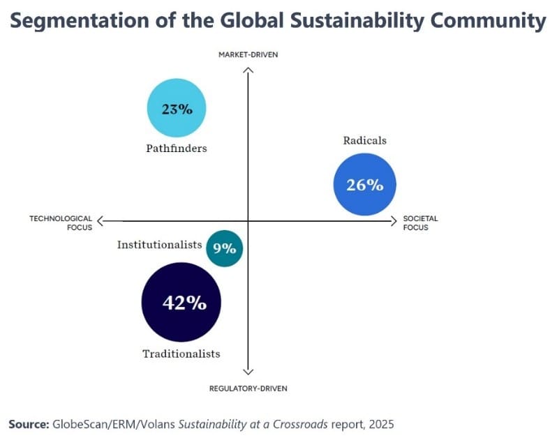 A GlobeScan fejlett szegmentációs elemzése négy, egymástól markánsan eltérő mentalitást azonosított a fenntarthatósági szakértők körében: