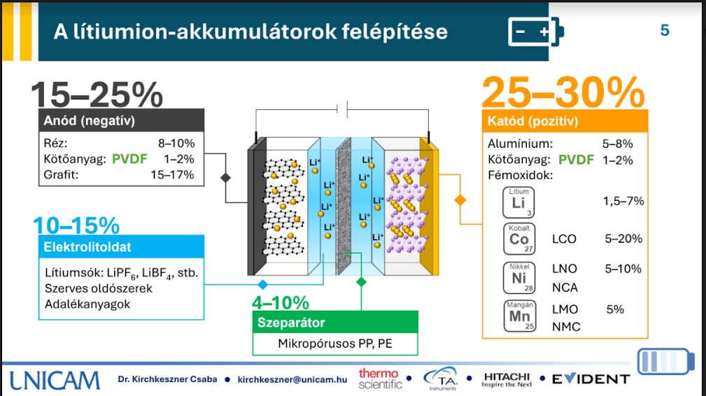 Az UNICAM képviseletében Dr. Kirchkeszner Csaba tartott előadást arról, hogy milyen fontos szerepe van a modern és korszerű műszeres analitikának az akkumulátorgyártás és újrahasznosítás során ahhoz, hogy fenntartható és biztonságos folyamatok mentén járjunk el. Gépi analitikával egyszerűen elvégezhető például a maradék szén és kén jelenlétének, illetve az NMP maradékának vizsgálata a gyártás és felújítás során. Ez utóbbinak alapfeltétele az oxigénmentes környezet, az argon-bevonatú kesztyű használata és egy távirányítású elemzőegység, amely a különböző lítiumsók jelenlétét, struktúráját és sérültségét méri, illetve azok reakcióképességét különböző környezeti feltételek mellett.