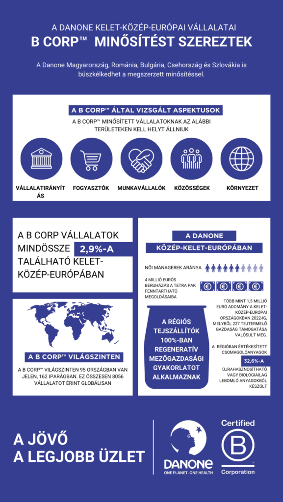 Várkonyi Beáta: A Danone alapító elnöke, Antoine Riboud fogalmazta meg a Danone kettős elkötelezettségét mind az üzleti eredmények és a társadalmi felelősség iránt, azaz, hogy egy jövőbe tekintő üzletnek nem szabad megállnia a gyárkapuknál. Azt gondolom, ez jól illusztrálja azt, hogy  vállalatunk számára a gazdasági fejlődés és a társadalmi hozzájárulás párhuzamos megvalósítása egyaránt fontos már nagyon régóta. Ezzel a B Corp hitvallása és értékrendszere teljesen összhangban áll. Éppen ezért lépett arra az útra és vállalta azt a Danone vállalatcsoportja, hogy a B Corp minősítéshez 2015-ben történő csatlakozást követően 2025-re elsők között lesz azon multinacionális cégek közül, amelyek ezt a minősítést megszerzik világszerte minden üzleti egységük esetében. Jó úton haladunk, 2023 végén a Danone vállalatok 80%-a már megszerezte a tanúsítványt. Nagyon büszkék vagyunk rá, hogy decemberben a közép-kelet-európai régió üzleti egységei (Magyarország, Románia, Bulgária, Csehország és Szlovákia) 103,3 ponttal valósították meg a célkitűzést.