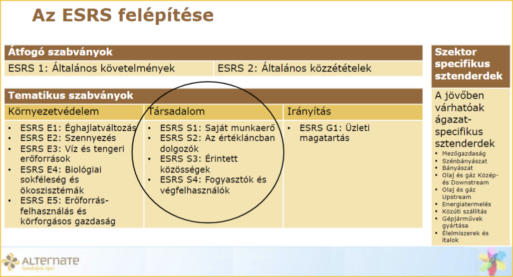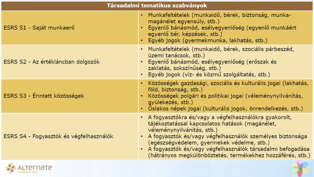 A társadalmi oldal fontosságát mutatja, hogy az ESRS európai jelentéstételi sztenderden és ehhez kapcsolódó törvényben belül már négy tematikus “társadalmi szabványt” is megfogalmaztak, amelyek egyre több társadalmi jellegű törvénnyel és direktívával egészülnek ki.
