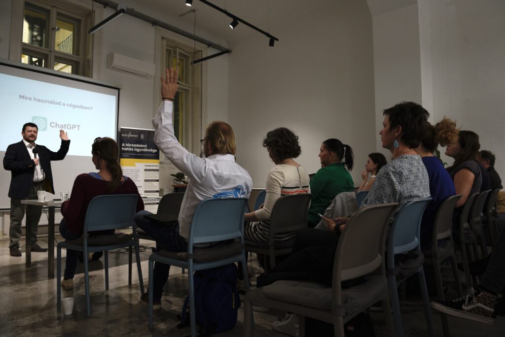 Zsúfolásig megtelt a Wesselényi utcai ImpactHub előadóterme a Hello Nonprofit május 9-én rendezett workshopján, amelyen a nonprofitok és a mesterséges intelligencia (MI) kapcsolatáról volt szó.