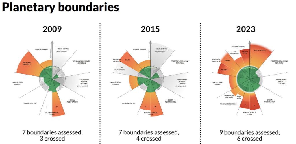 Ha a bolygó létfenntartó funkcióiról beszélünk, érdemes megemlíteni Rockström kutató ábráját a bolygóhatárokról, ami bemutatja, hogy bizonyos témákban (bioszféra-integritás változása, biogeokémiai áramlások, földhasználat változása, klímaváltozás, óceánok savasodása, édesvíz-használat, sztratoszférikus ózon csökkenése, atmoszférikus aeroszol ülepedése, új anyagok bevezetése) átléptük-e a határt, és ha igen mennyire: