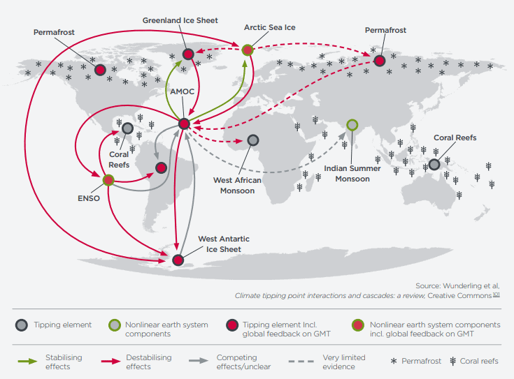 Az emberi tevékenység okozta klímaváltozás és a természeti erőforrások pusztítása a Föld rendszerének stabilitását sodorják veszélybe. A következmények – tűzvészek, áradások, hőhullámok, szárazságok – már most súlyosak, és a további tétlenség katasztrofális jövőt vetít előre. A szerzők kiemelik a klímatöréspontok (tipping points) veszélyét, amelyek bekövetkezése dominószerűen további összeomlásokat idézhet elő. Több töréspont átlépése után a klíma stabilizálása akár lehetetlenné is válhat.